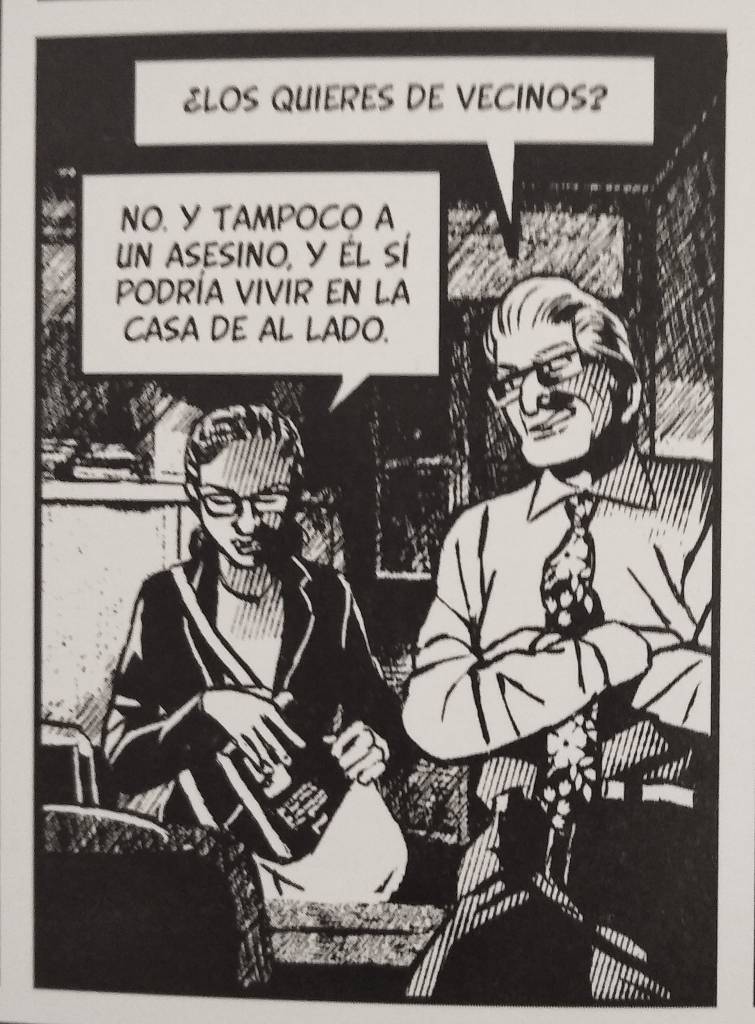 Me ha gustado mucho la parte gráfica, realista o casi hiperrealista, llena de detalles, en blanco y negro muy contrastado, en lo que debe ser la técnica del claroscuro que parece ir a la par con los claroscuros de sus personajes. En cuanto al contenido, me parece muy bien lo que plantea y como reparte juego, pero no tanto como resuelve, queda todo muy abierto, algo ambiguo. Aunque seguramente el mismo tema (la posibilidad de reinserción en delincuentes sexuales) ya es de por tan ambiguo como la novela refleja.